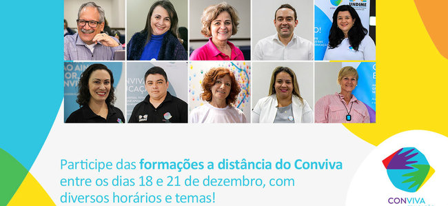 Entre 18 e 21 de dezembro, o Conviva Educação realiza formações a distância de cinco diferentes temas, com duração de até 2 horas cada e gratuitas. Elas estarão disponíveis em vídeo nos seguintes horários: 10h, 12h, 14h, 16h e 18h (hora de Brasília e de verão). Para participar, basta você fazer a inscrição e estar com seu computador (ou celular) com acesso à internet no momento da transmissão.