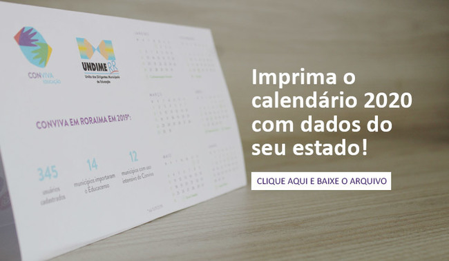 Além das indicações de meses e feriados nacionais, o calendário traz dados quantitativos sobre o Conviva em seu estado em 2019: usuários cadastrados, municípios que importaram o Educacenso e tiveram uso intensivo da plataforma.