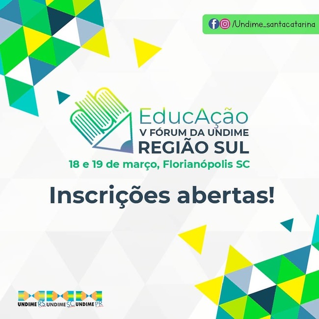 A Undime Região Sul, que compreende as seccionais do Paraná, Santa Catarina e Rio Grande do Sul, realizará nos dias 18 e 19 de março de 2020 o V Fórum Undime Região Sul, no Oceania Convention Center, em Florianópolis (SC).