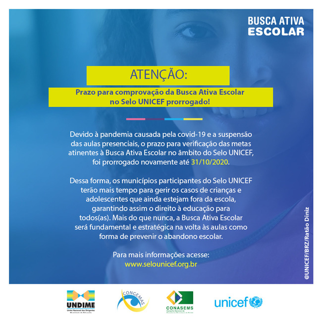 Devido à pandemia causada pela covid-19 e a suspensão das aulas presenciais, o prazo para verificação das metas atinentes à Busca Ativa Escolar no âmbito do Selo Unicef, foi prorrogado novamente até 31 de outubro de 2020.