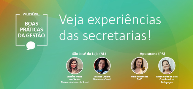 As representantes de São José da Laje são: Janaíne Maria dos Santos, técnica de ensino da Secretaria Municipal de Educação (Smed), e Rosiene Omena, diretora na Smed. De Apucarana, participam Marli Fernandes, Dirigente Municipal de Educação (DME), e Rosana Braz da Silva, Coordenadora Pedagógica da Autarquia de Educação. O vídeo, assim como as demais produções do Conviva, pode ser acessado na íntegra na Galeria de vídeos da plataforma. Se preferir, clique abaixo:
