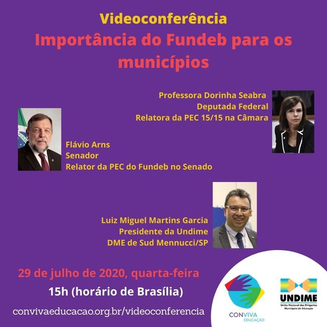 Na próxima quarta-feira, 29 de de julho, será realizada videoconferência sobre a importância do Fundeb para os municípios. O debate, marcado para às 15 horas (horário de Brasília), vai contar com a participação da deputada Professora Dorinha Seabra Rezende, que foi a relatora da PEC 15/15 na Comissão Especial do Fundeb da Câmara dos Deputados; e o senador Flávio Arns, relator da proposta no Senado. A mediação será do presidente da Undime, Luiz Miguel Martins Garcia, Dirigente Municipal de Educação de Sud Mennucci (SP). A proposta é explicar as principais mudanças a partir do texto aprovado pela Câmara, a mobilização para que ele seja aprovado no Senado e a importância do Fundeb para os municípios. Entenda Na noite da última terça-feira, 21 de julho, a PEC 15/2015 foi aprovada em dois turnos pela Câmara dos Deputados. Para a Undime, isso representa uma vitória conquistada a muitas mãos: parlamentares, governadores, prefeitos, secretários municipais e estaduais de educação, professores e trabalhadores da educação, especialistas, educadores, estudantes e famílias. Com essa proposta do Fundeb, as redes públicas municipais e estaduais terão mais condições para aprimorar o processo de ensino-aprendizagem nas escolas e centros de educação infantil; valorizar os profissionais de educação, sua carreira e promover a formação; implementar e garantir padrões de qualidade por meio do Custo-Aluno Qualidade (CAQ); e garantir o direito à educação com acesso, permanência e aprendizagem a todas as crianças, adolescentes, jovens e adultos de todo o país. En nota, o presidente da Undime afirma que "A discussão continuará no Senado Federal e acreditamos que, se houver alguma alteração no texto, será com o objetivo de aprimorá-lo. Afinal, não é possível retroceder nas conquistas obtidas hoje e ao longo dos últimos anos. É preciso considerar que as metas e estratégias do Plano Nacional de Educação e dos planos decenais de educação municipais e estaduais precisam ser cumpridas". Para acompanhar o debate na quarta-feira (29) ao vivo, basta acessar: https://www.youtube.com/user/undimenac ou https://convivaeducacao.org.br/videoconferencia Fonte: Undime