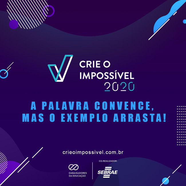 Voltado a estudantes do Ensino Médio da rede pública, o “Crie o Impossível” é uma iniciativa da organização sem fins lucrativos Embaixadores da Educação e co-realizado pelo Sebrae Minas. Com o lema “A palavra convence, mas o exemplo arrasta”, o propósito do projeto é despertar sonhos e abrir perspectivas para alunos de escolas públicas por meio de histórias reais. A ideia, segundo os fundadores, é que o evento seja a aula mais inspiradora da vida do estudante.