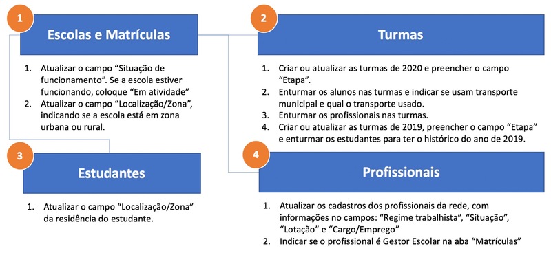 As questões da ferramenta de Memorial que permitem essa integração estão indicadas com a letra “i” e são acompanhadas de explicações e dicas. Nas áreas de Transporte, Estrutura e Documentação e Pessoas há uma maior complexidade: para puxar automaticamente os dados das escolas e matrículas do ano (questões 2 e 3 de Estrutura e Documentação), os profissionais da rede (questões 2 e 5 de Pessoas) e os estudantes atendidos pelo transporte (questão 3 de Transporte Escolar), veja o esquema a seguir: