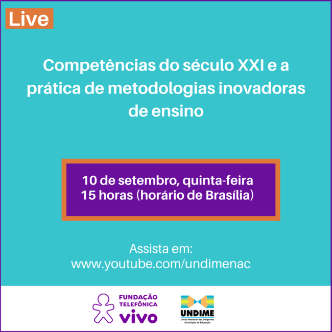 A Undime realiza, nesta quinta-feira, 10 de setembro, live com a temática "Competências do século XXI e a prática de metodologias inovadoras de ensino". O debate é uma iniciativa junto à Fundação Telefônica Vivo e está marcado para às 15 horas (horário de Brasília).
