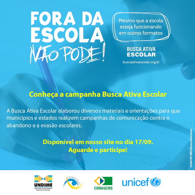 A campanha Busca Ativa Escolar estará disponível a partir de quinta-feira, 17 de setembro, no site: buscaativaescolar.org.br.