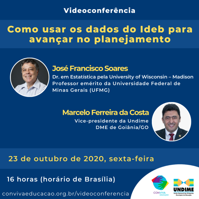 Na sexta-feira, 23 de outubro, o Conviva Educação realiza videoconferência sobre como usar os dados do Ideb para avançar no planejamento. O debate está marcado para às 16 horas (horário de Brasília) e será transmitido pelo canal da plataforma no Youtube.
