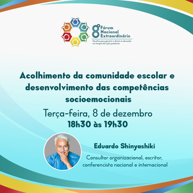 No dia 8 dezembro (terça-feira), será realziado um debate sobre acolhimento da comunidade escolar e desenvolvimento das competências socioemocionais. Para falar sobre isso, o palestrante confirmado é Eduardo Shinyashiki, consultor organizacional e escritor, além de conferencista nacional e internacional. A mesa está marcada para iniciar às 18h30 (horário de Brasília) e deverá ter uma hora de duração.