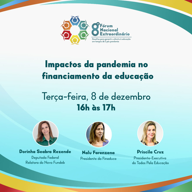 No dia 8 de dezembro (terça-feira), Priscila Cruz, presidente-executiva e co-fundadora do Todos pela Educação; Nalu Farenzena, presidente da Associação Nacional de Pesquisadores em Financiamento da Educação (Fineduca); e a deputada federal Professora Dorinha, presidente da Frente Parlamentar Mista da Educação e relatora do Novo Fundeb na Câmara dos Deputados são as palestrantes confirmadas para falar sobre os impactos da pandemia no financiamento da educação.