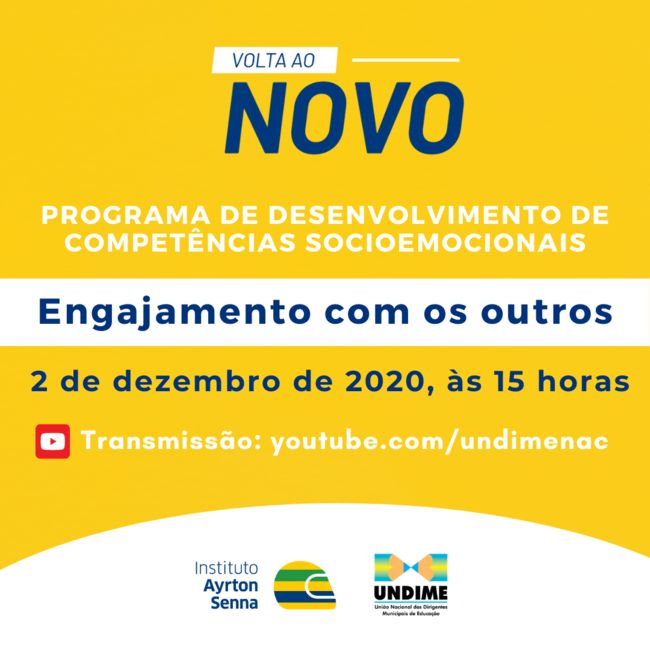 O Instituto Ayrton Senna e a União Nacional dos Dirigentes Municipais de Educação (Undime) realizam, no dia 2 de dezembro, o quinto e último encontro da série “Volta ao Novo”. Os temas abordados até o momento foram resiliência emocional, abertura ao novo, autogestão e amabilidade. Agora chegou a vez de conversar sobre engajamento com os outros.