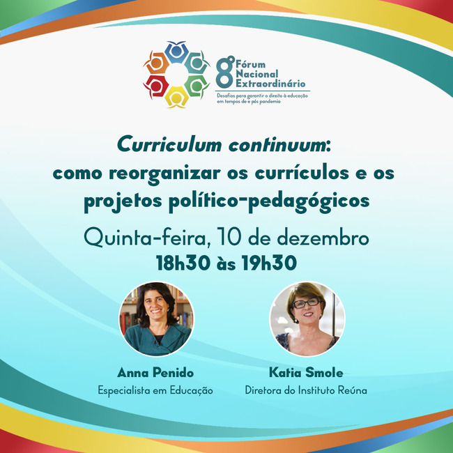 No dia 10 dezembro (quinta-feira), será realizado o debate intitulado "Curriculum continuum: como reorganizar os currículos e os projetos político-pedagógicos". E para tratar desse assunto, estão confirmadas as participações de Katia Smole, diretora do Instituto Reúna e Anna Penido, especialista em Educação.