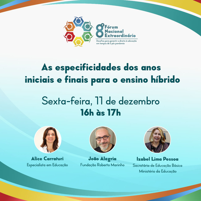 No dia 11 dezembro (sexta-feira), será realizado um debate sobre “As especificidades dos anos iniciais e finais para o ensino híbrido” com foco no momento que estamos passando. Para falar sobre esse assunto, estão confirmados: Izabel Lima Pessoa, secretária de Educação Básica do Ministério da Educação; João Alegria, gerente Geral do LEd - Laboratório de Educação da Fundação Roberto Marinho; e Maria Alice Carraturi, especialista em educação.
