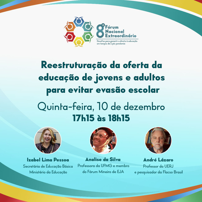 No dia 10 dezembro (quinta-feira), será realizado o debate sobre "Reestruturação da oferta da educação de jovens e adultos para evitar evasão escolar" que vai contar com a participação da secretária de Educação Básica do Ministério da Educação, Izabel Lima Pessoa; André Lázaro, professor da Universidade do Estado do Rio de Janeiro (UERJ); e Analise da Silva, professora da Univerdade Federal de Minas Gerais (UFMG) e membro do Fórum Mineiro de EJA.