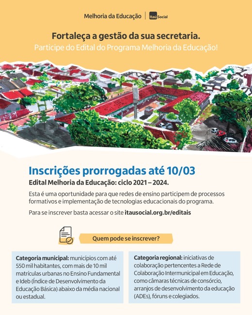 O fortalecimento das secretarias municipais de educação para garantir acesso, permanência e aprendizado com equidade aos estudantes é o objetivo do programa Melhoria da Educação, realizado pelo Itaú Social, que está com inscrições abertas até o dia 10 de março, no site da instituição. O programa atua por meio de formação de profissionais de educação, iniciando  com um processo de planejamento estratégico, para que seja possível identificar as áreas em que são necessárias intervenções.