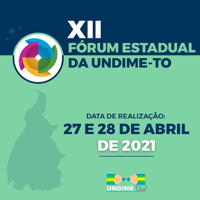 A União dos Dirigentes Municipais de Educação do Tocantins (Undime/ TO), atendendo a seu estatuto e regimento interno, realizará o XII Fórum Estadual Ordinário, tendo como pauta o tema "Desafios e Perspectivas da Educação Municipal no Contexto da Pandemia", além da realização da eleição e posse da nova Diretoria Executiva para o biênio 2021/2023 e demais assuntos gerais de interesse da entidade.  O evento será realizado nos dias 27 e 28 de abril de 2021, com previsão para inicio às 9h em ambos os dias, por meio remoto, sendo transmitido no canal de Youtube da instituição e pelo Google Meet.