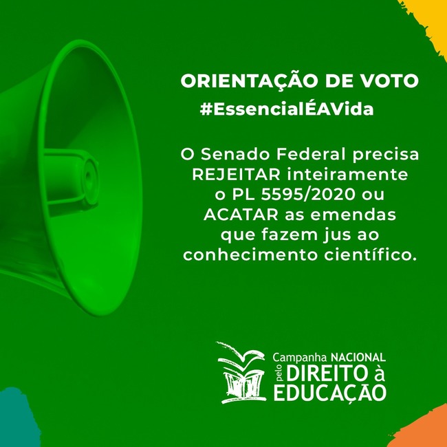 A Campanha Nacional pelo Direito à Educação ratifica seu posicionamento contrário ao PL 5595/2020 e orienta que o Senado Federal rejeite inteiramente o Projeto de Lei ou acate as emendas que fazem jus ao conhecimento científico. Pontua também que é possível a construção de um acordo, desde que se retire a educação como atividade essencial e se incorpore as emendas que qualificam o PL, conforme demonstrado em análise publicada pela instituição.
