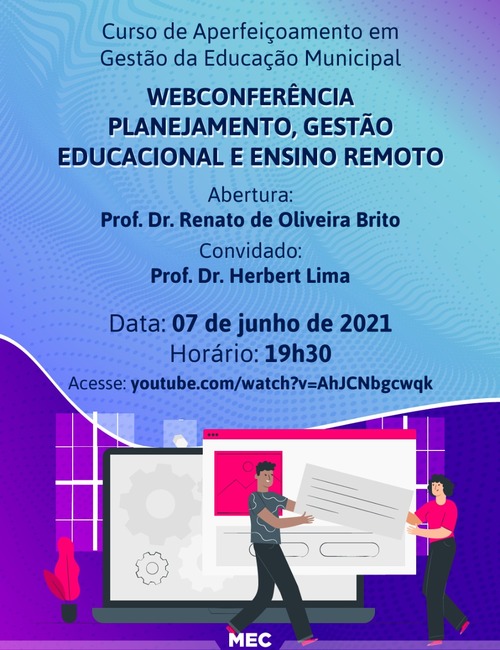Na próxima segunda-feira, 7 de junho, às 19h30, será realizada a primeira webconferência do Curso de Aperfeiçoamento em Gestão da Educação Municipal, ofertado pela Secretaria de Educação Básica do Ministério da Educação, em parceria com a Universidade Federal de São Carlos. Neste primeiro encontro, o professor Herbert Lima, especialista na área e Dirigente Municipal de Educação de Sobral/ CE, debaterá sobre “Planejamento, gestão educacional e ensino remoto”.