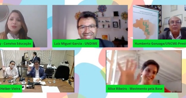 Dia 7 de julho, a plataforma Conviva Educação realizou uma videoconferência sobre a Base Nacional Comum Curricular (BNCC) e os próximos passos para a implementação dos currículos. Estiveram presentes Luiz Miguel Martins Garcia (presidente da União Nacional dos Dirigentes Municipais de Educação/Undime e Dirigente Municipal de Educação de Sud Mennucci/SP), Manoel Humberto Gonzaga Lima (presidente da União Nacional dos Conselhos Municipais de Educação/Uncme), Alice Ribeiro (Secretária Executiva do Movimento pela Base) e Helber Ricardo Vieira (Secretário Adjunto de Educação Básica do Ministério da Educação/MEC).