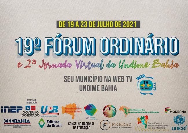 Do dia 19 a 23 de julho, a Undime Bahia promove o 19º Fórum Ordinário e 2ª Jornada Virtual. O evento é on-line, transmitido pelo Youtube e Facebook, através do canal Web TV Undime Bahia e tem como tema principal “A Bahia mobilizada no fortalecimento do planejamento de ações para a educação municipal”.