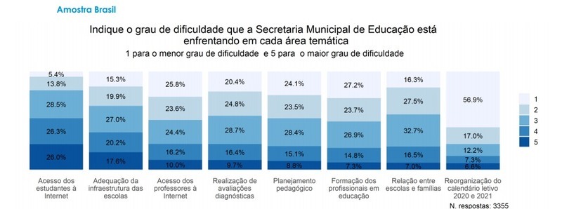 A pesquisa buscou informações sobre quatro aspectos: como foi a transição entre os anos letivos de 2020 e 2021; quais foram as estratégias de ensino adotadas este ano; como está o planejamento para o segundo semestre e quais os principais desafios das secretarias municipais de educação.