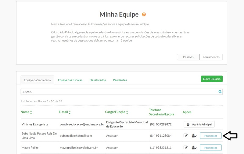 - Acessando a ferramenta Minha Equipe você encontra duas opções: “pessoas” e “ferramentas”. Ao clicar em “pessoas”, vê quais profissionais das secretarias e das escolas estão cadastrados. No item “ferramentas” é possível ver a permissão atual de uso das ferramentas de cada cadastrado, como visualização ou edição. Ter o controle sobre as informações do município é essencial!