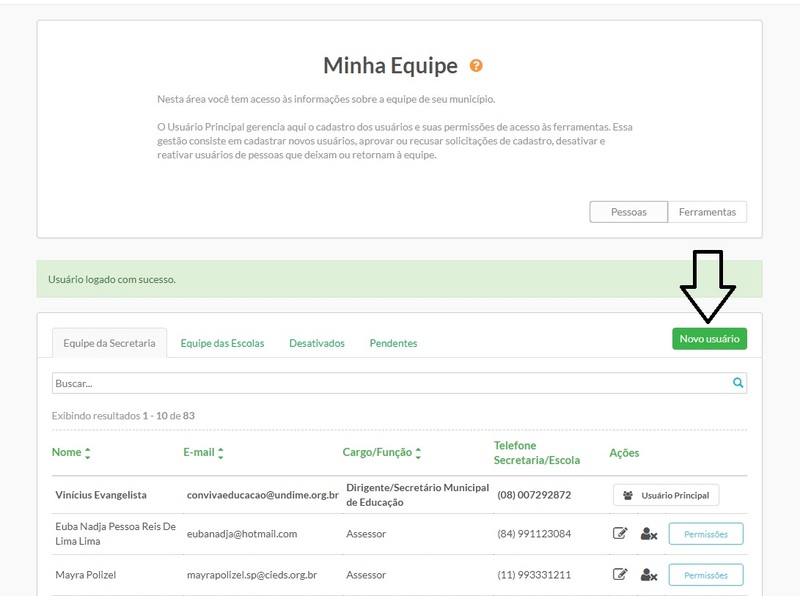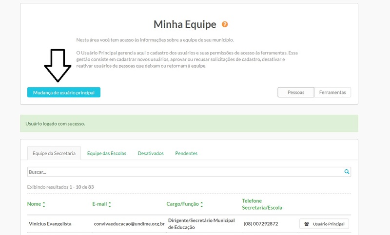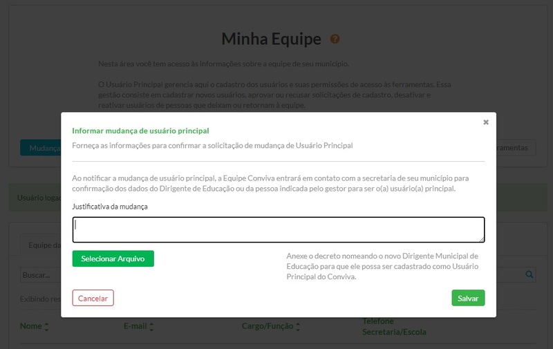 Em caso de troca do Dirigente Municipal de Educação ou da pessoa indicada pela gestão para ser o usuário principal, basta que qualquer usuário acesse a área de Minha Equipe e clique em: Mudança de Usuário Principal.