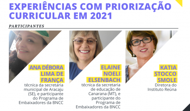 Neste dia 26 de agosto, às 14h (horário de Brasília), o tema do vídeo será sobre experiências com priorização curricular em 2021. As convidadas são: