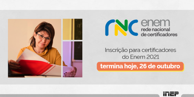 O Instituto Nacional de Estudos e Pesquisas Educacionais Anísio Teixeira (Inep) reabriu, na sexta-feira, 22 de outubro, a inscrição para a Rede Nacional de Certificadores (RNC) do Exame Nacional do Ensino Médio (Enem) 2021. A chamada pública para cadastramento e habilitação de colaboradores na RNC foi publicada no Diário Oficial da União, por meio do Edital n.º 65/2021. Os interessados podem se inscrever até 26 de outubro, por meio do Sistema RNC.