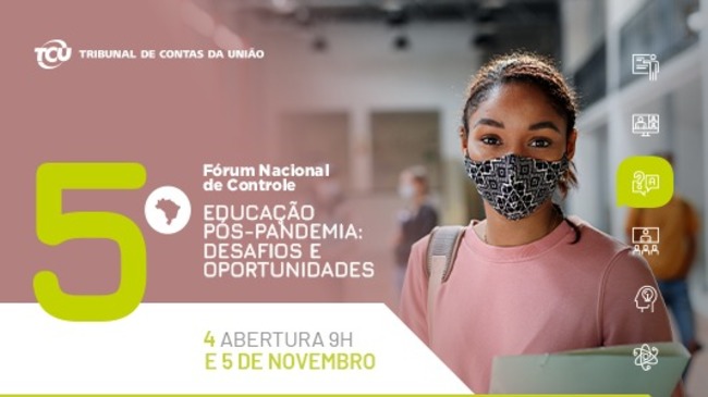 O Tribunal de Contas da União (TCU) promoverá nos dias 4 e 5 de novembro, a 5ª edição do Fórum Nacional de Controle. Em 2021, o evento será em formato híbrido, online e presencial, e terá como tema central a educação pós pandemia da Covid-19.