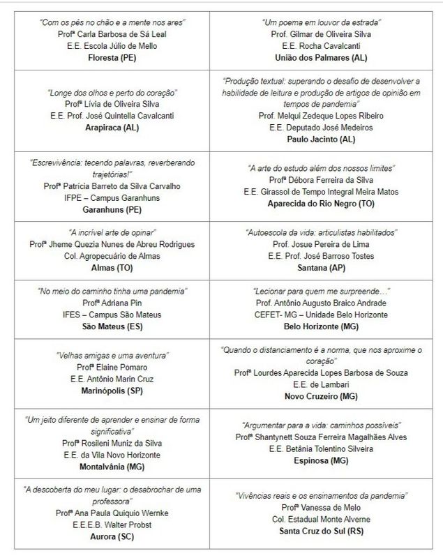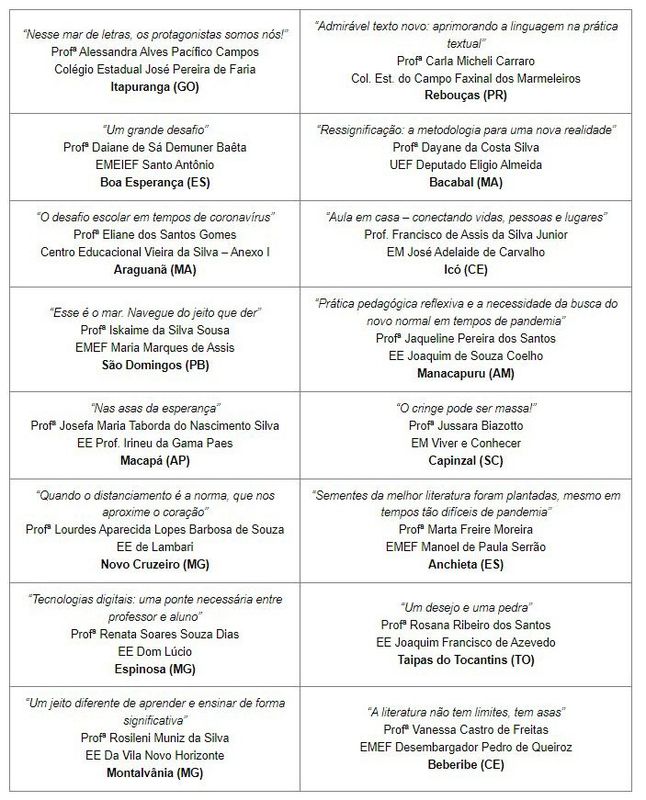 A Olimpíada de Língua Portuguesa divulgou a lista das professoras e professores classificados para a etapa final. Foram selecionados 16 finalistas em cada uma das categorias Crônica, Artigo de Opinião, Memórias Literárias, Documentário e Poema, totalizando 80 docentes de 23 estados. A celebração dos vencedores ocorrerá no dia 10 de dezembro (sexta-feira), às 18h horas (horário de Brasília), em evento virtual transmitido pelo canal do YouTube do programa Escrevendo o Futuro.