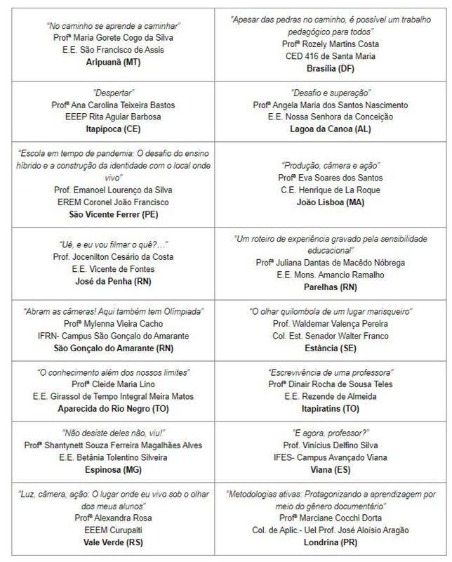 Já os professores puderam discutir as possibilidades do Relato de Prática e do trabalho com Documentário. Além disso, houve espaço para a troca de vivências e discussão dos desafios no ensino deste gênero, sobretudo no contexto de pandemia e aulas remotas.