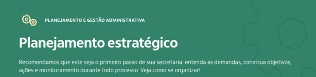 Planejamento Estratégico: tem por objetivo auxiliar as equipes das secretarias de educação na elaboração, de forma autônoma, de um Plano Estratégico consistente. Ele deverá ser construído com base em um diagnóstico concreto e em muito diálogo, com mobilização e responsabilização, e, fundamentalmente, com metas plausíveis, possíveis de serem alcançadas no tempo da gestão.