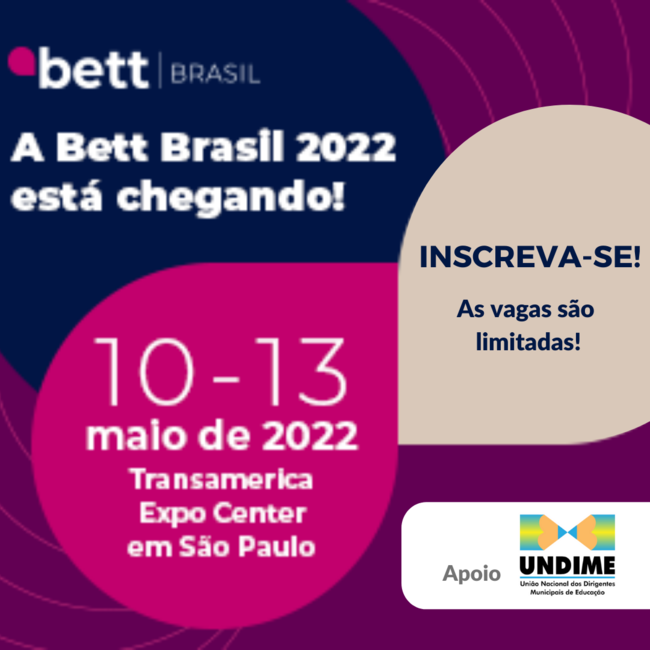 A Bett Brasil, evento de educação, inovação e tecnologia, será realizada de 10 a 13 de maio de 2022, no Transamerica Expo Center, em São Paulo. O evento acontecerá no formato híbrido, com palestras, conteúdos e exposição de produtos e serviços tanto no presencial como no ambiente digital. As inscrições estão abertas e devem ser realizadas por meio do site oficial.