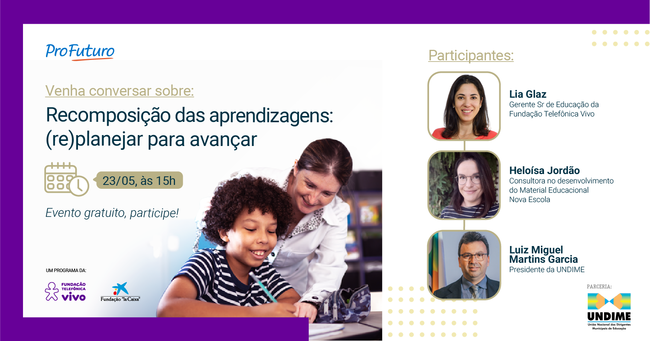 A live será um bate-papo com a participação do presidente da Undime, Luiz Miguel Martins Garcia, Dirigente Municipal de Educação de Sud Mennucci/SP; Lia Glaz, gerente sênior de Educação da Fundação Telefônica Vivo; e Heloísa Jordão, consultora no desenvolvimento do Material Educacional da Nova Escola. O evento é gratuito e aberto ao público interessado em acompanhar.