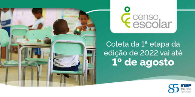 A coleta da primeira etapa do Censo Escolar 2022 segue em andamento. Os responsáveis devem declarar os dados no Sistema Educacenso, até o dia 1º de agosto, de forma on-line ou por migração. A última quarta-feira do mês de maio, instituída como o Dia Nacional do Censo Escolar da Educação Básica, é a data de referência para a declaração. Nesta etapa, o Instituto Nacional de Estudos e Pesquisas Educacionais Anísio Teixeira (Inep) apura dados sobre os estabelecimentos de ensino, turmas, alunos, gestores e profissionais escolares em sala de aula.