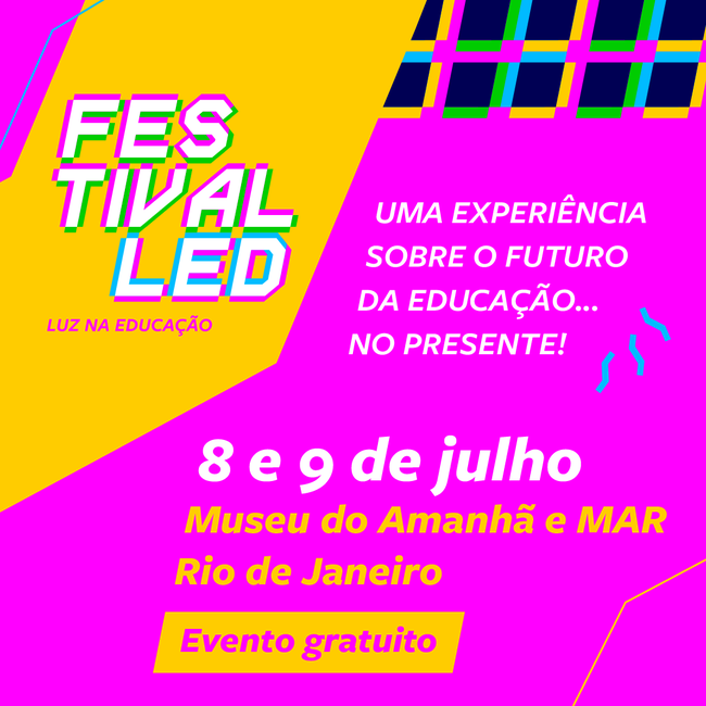 Nos dias 8 e 9 de julho, será realizada a 1ª edição do Festival LED - Luz na Educação. A proposta é experimentar o futuro da educação, no presente. Com palestrantes nacionais e internacionais, oficinas, experimentações, feira de startups, exposições, intervenções artísticas, batalha de pitch e muita troca de conhecimento, o festival ocupará o Museu do Amanhã e o Museu de Arte do Rio (MAR), no Rio de Janeiro.