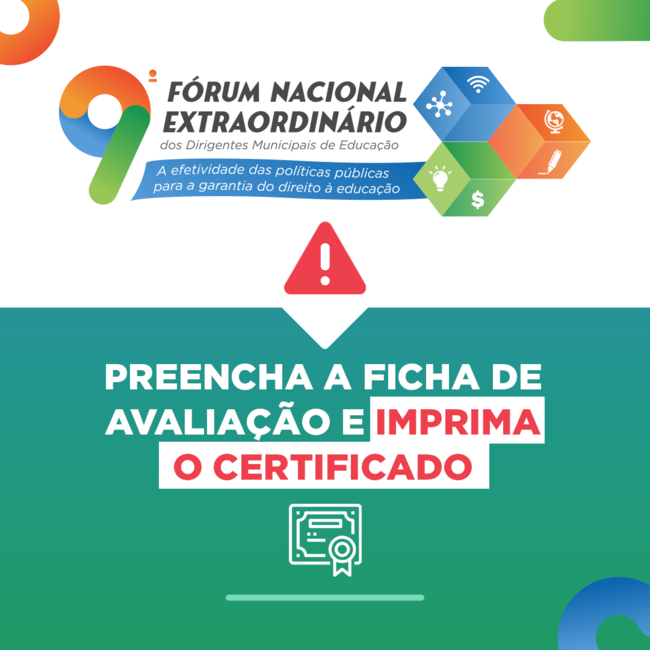 As pessoas que participaram do 9º Fórum Nacional Extraordinário dos Dirigentes Municipais de Educação, realizado de 16 a 19 de agosto, em Brasília, já estão aptas a emitir o certificado de participação. Entretanto, é condição preencher a ficha de avaliação do evento. Todo o processo deve ser realizado pelo site oficial do Fórum em forumnacionalundime2022.com.br