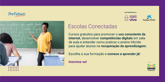 No dia 15 de agosto, tiveram início as turmas dos cursos de formação continuada a distância oferecidos pela parceria entre a Undime e a Fundação Telefônica Vivo. Disponibilizados gratuitamente aos educadores na plataforma Escolas Conectadas, as formações podem ser iniciadas pelos cursistas imediatamente após a inscrição e concluídas em até 60 dias. Os interessados podem realizar a inscrição até o dia 16 de setembro.
