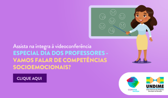 Na última terça-feira, dia 11 de outubro, a Undime realizou videoconferência aberta ao público com o intuito de celebrar o Dia dos(as) Professores(as), que oficialmente é comemorado no sábado, dia 15. O debate teve como temática "Especial dia dos professores - Vamos falar de competências socioemocionais?" e foi transmitido pelo Conviva Educação. O vídeo com a íntegra do bate-papo já está disponível na galeria da plataforma. Confira aqui.