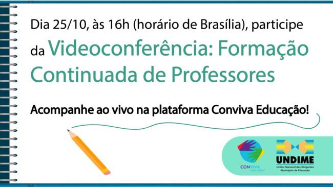 Na terça-feira, 25 de outubro, vamos realizar videoconferência sobre Formação Continuada de Professores. A proposta é falar sobre a Resolução do Conselho Nacional de Educação que dispõe sobre as Diretrizes Curriculares Nacionais para a Formação Continuada de Professores da Educação Básica e institui a Base Nacional Comum para a Formação Continuada de Professores da Educação Básica (BNC-Formação Continuada). A transmissão será pelo nosso canal no Youtube e está marcada para às 16h (horário de Brasília).