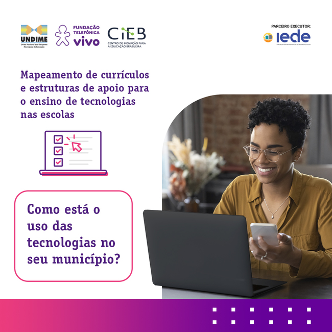 Realizar um mapeamento de currículos e componentes curriculares para o ensino de tecnologia e computação e das estruturas que as Secretarias Municipais de Educação possuem para o apoio pedagógico e técnico ao uso de tecnologias digitais. Esse é o objetivo da pesquisa realizada pelo Centro de Inovação para Educação Brasileira (CIEB), Fundação Telefônica Vivo (FTV) e União Nacional dos Dirigentes Municipais de Educação (Undime), com apoio técnico do Interdisciplinaridade e Evidências no Debate Educacional (Iede).