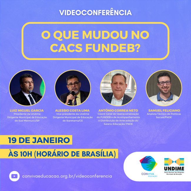 A transmissão será na quinta-feira, dia 19 de janeiro, às 10h (horário de Brasília), na plataforma Conviva Educação e no Youtube. Participam o presidente da Undime, Luiz Miguel Garcia, Dirigente Municipal de Educação de Sud Mennucci/SP; o vice-presidente da Undime, Alessio Costa Lima, Dirigente Municipal de Educação de Ibaretama/CE; Antônio Correa Neto, coordenador-geral de Operacionalização do Fundeb e de Acompanhamento e Distribuição de Arrecadação do Salário-Educação do FNDE; e Samuel Martins Feliciano, Analista Técnico de Políticas Sociais do FNDE.