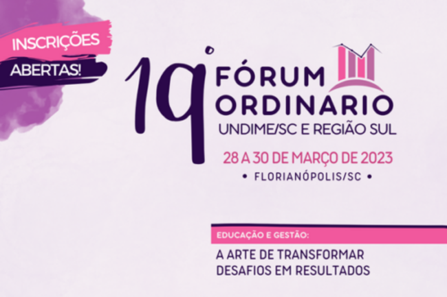 A seccional catarinense da Undime abre as inscrições para o 19º Fórum Ordinário Undime/SC e Região Sul a se realizar de 28 a 30 de março, no Centro de Convenções Oceania, em Florianópolis/SC, com vagas limitadas e sorteio de inscrição, gratuita, entre os 100 primeiros participantes.