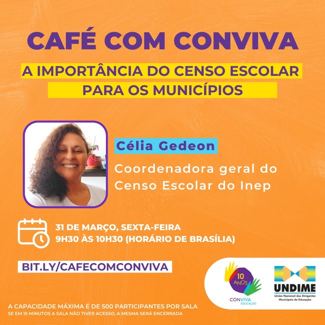 A importância do Censo Escolar para os municípios será a pauta do proximo diálogo do Café com Conviva, nesta sexta-feira, 31 de março, às 9h30 (horário de Brasília). A convidada desta edição que irá abordar sobre o assunto, será a coordenadora geral do Censo Escolar do Instituto de Pesquisas Educacionais Anísio Teixeira (Inep), Célia Gedeon.