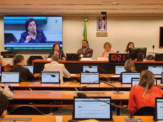 O aumento dos atos de violência em escolas e creches no Brasil foi tema de audiência pública na Comissão de Previdência, Assistência Social, Infância, Adolescência e Família, da Câmara dos Deputados, nesta quarta-feira (19). Na ocasião, a Undime estava representada pela presidente da seccional Sergipe, Josevanda Franco, Dirigente Municipal de Educação de Nossa Senhora do Socorro/SE, que começou sua participação abordando o tema central do debate. "A primeira coisa que temos que pensar é que não se trata da violência que nós estamos acostumados a trabalhar. Na escola, as formas de violência estão relacionadas à violência contra a pessoa, contra a propriedade ou contra o patrimônio. Agora nós estamos enfrentando a violência da sociedade para com a escola", comentou.
