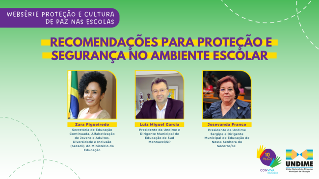 O primeiro episódio da websérie vai ao ar no dia 15 de maio, às 15h (horário de Brasília), e terá como tema “Recomendações para proteção e segurança no ambiente escolar”, com a participação da secretária de Educação Continuada, Alfabetização de Jovens e Adultos, Diversidade e Inclusão (Secadi), do Ministério da Educação (MEC), Zara Figueiredo Tripodi; do presidente da Undime e Dirigente Municipal de Educação de Sud Mennucci/SP, Luiz Miguel Garcia; e mediação da presidente da Undime Sergipe e Dirigente Municipal de Educação de Nossa Senhora do Socorro/SE, Josevanda Franco.