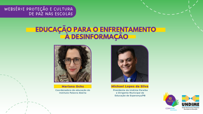 A Undime, por meio do Conviva Educação, vai realizar nesta terça-feira (16), às 15h (horário de Brasília),  o segundo episódio da websérie para promover a cultura de paz nas escolas brasileiras. O tema será “Educação para o enfrentamento à desinformação”, e terá a participação do presidente da Undime Paraíba e Dirigente Municipal de Educação de Esperança/PB, Michael Lopes da Silva, e da coordenadora de educação do Instituto Palavra Aberta, Mariana Ochs.