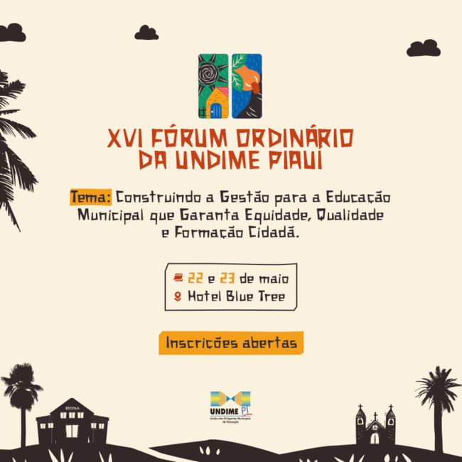 Com o tema “Construindo a Gestão para a Educação Municipal que Garanta Equidade, Qualidade e Formação Cidadã”, a União dos Dirigentes Municipais de Educação do Piauí (Undime/PI) promoverá, nos dias 22 e 23 de maio, XVI Fórum Ordinário da Undime Piauí. O evento acontece no Hotel Blue Tree, em Teresina, e reúne grandes nomes brasileiros da área de gestão em educação.
