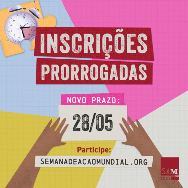 A 20ª Semana de Ação Mundial, maior ação coletiva em prol da educação do planeta, vai acontecer entre os dias 19 e 26 de junho e está com as inscrições prorrogadas até 28 de maio. Como acontece a cada edição,a Campanha Nacional pelo Direito à Educação, como realizadora da SAM, fará o envio gratuito de materiais e certificados para as/os participantes. As inscrições para realizar uma atividade da SAM 2023 e para receber os materiais impressos gratuitamente pelos correios podem ser feitas neste link. Haverá certificado de participação mediante envio de relatório das atividades realizadas. Veja mais informações abaixo.
