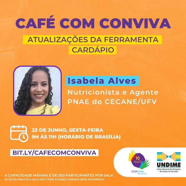 A convidada para esta edição do Café com Conviva é Isabela Alves, nutricionista e agente do Programa Nacional de Alimentação Escolar (Pnae) do Centro Colaborador em Alimentação e Nutrição Escolar (Cecane), da Universidade Federal de Viçosa. O bate-papo será de 9h às 11h e é aberto ao público.